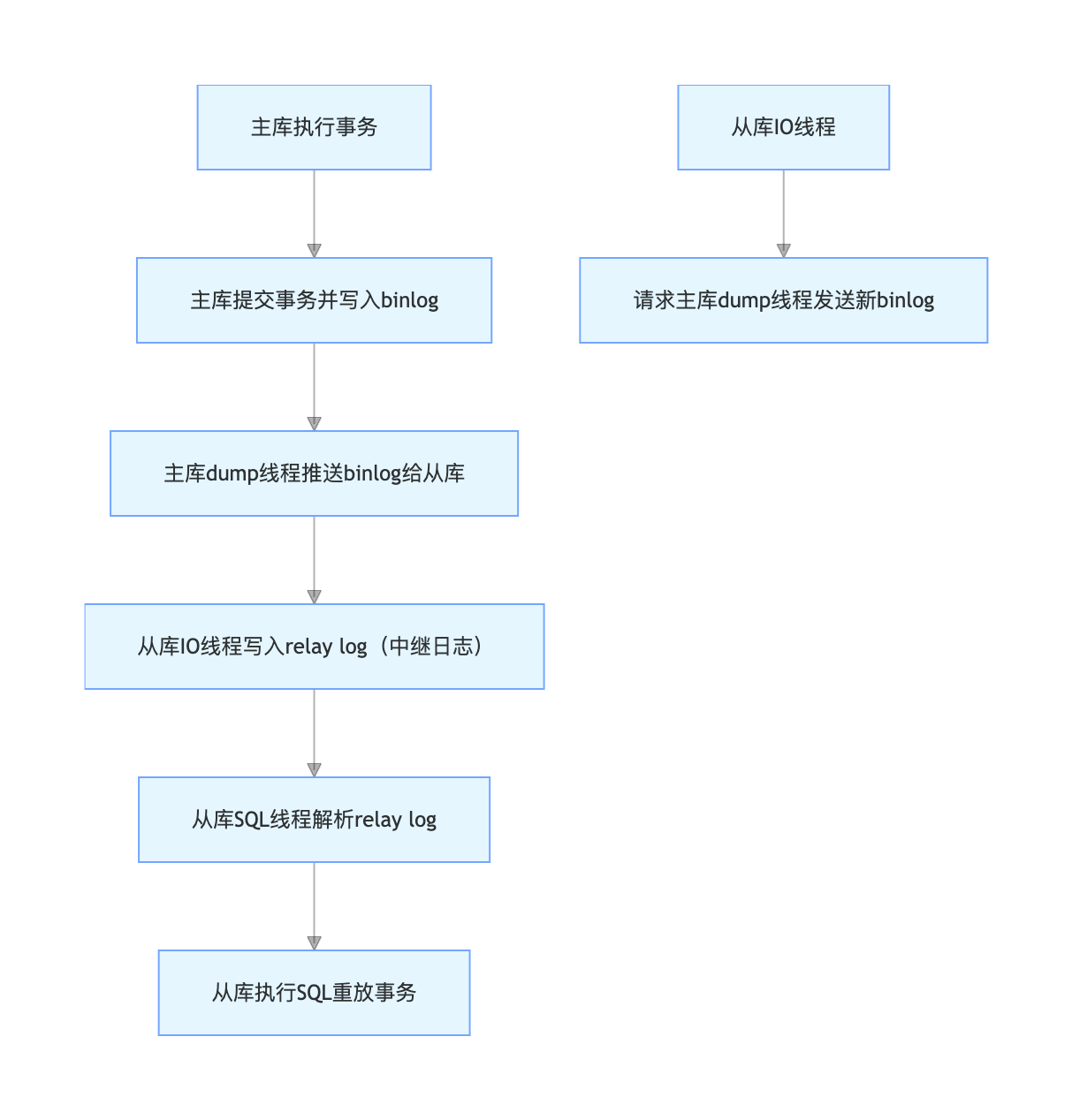 binlog:主库记录所有数据修改操作的日志,是同步的数据源;relay log:从库本地存储的主库 binlog 副本,避免直接读取主库 binlog 导致性能损耗;dump线程:主库专门用于给从库推送 binlog 的线程;IO线程:从库负责拉取 binlog 的线程;SQL线程:从库负责解析 relay log 并执行的线程。